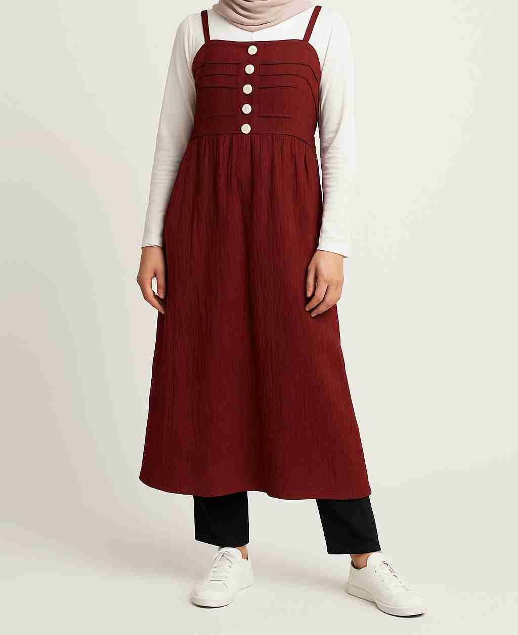 Elevate your modest wardrobe with this elegant maroon textured pinafore dress. Designed with a crinkle fabric finish, it features a flattering A-line silhouette, dainty shoulder straps, and chic front button detailing. Suitable for S, M, and L sizes. This versatile piece ensures a comfortable and stylish fit. Layered over a white long-sleeve inner, it pairs effortlessly with sneakers for a casual day out or can be styled with heels for a more refined look. This dress offers both comfort and style—ideal for casual outings, workdays, or modest fashion looks.