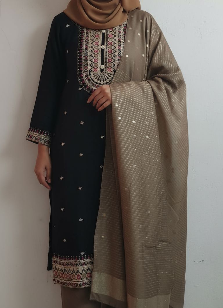 The “Mocha Noir Kurta Set” features a striking combination of deep black with intricate embroidered details in gold, taupe, and rose on the neckline, hem, and cuffs. Paired with an elegant shimmer dupatta in coordinated mocha and gold hues, this look channels classic grace with a modern edge. The ensemble is finished with a perfectly matching mocha-toned hijab and straight pants, making it ideal for festive gatherings or evening occasions, where understated luxury and sophistication are desired.